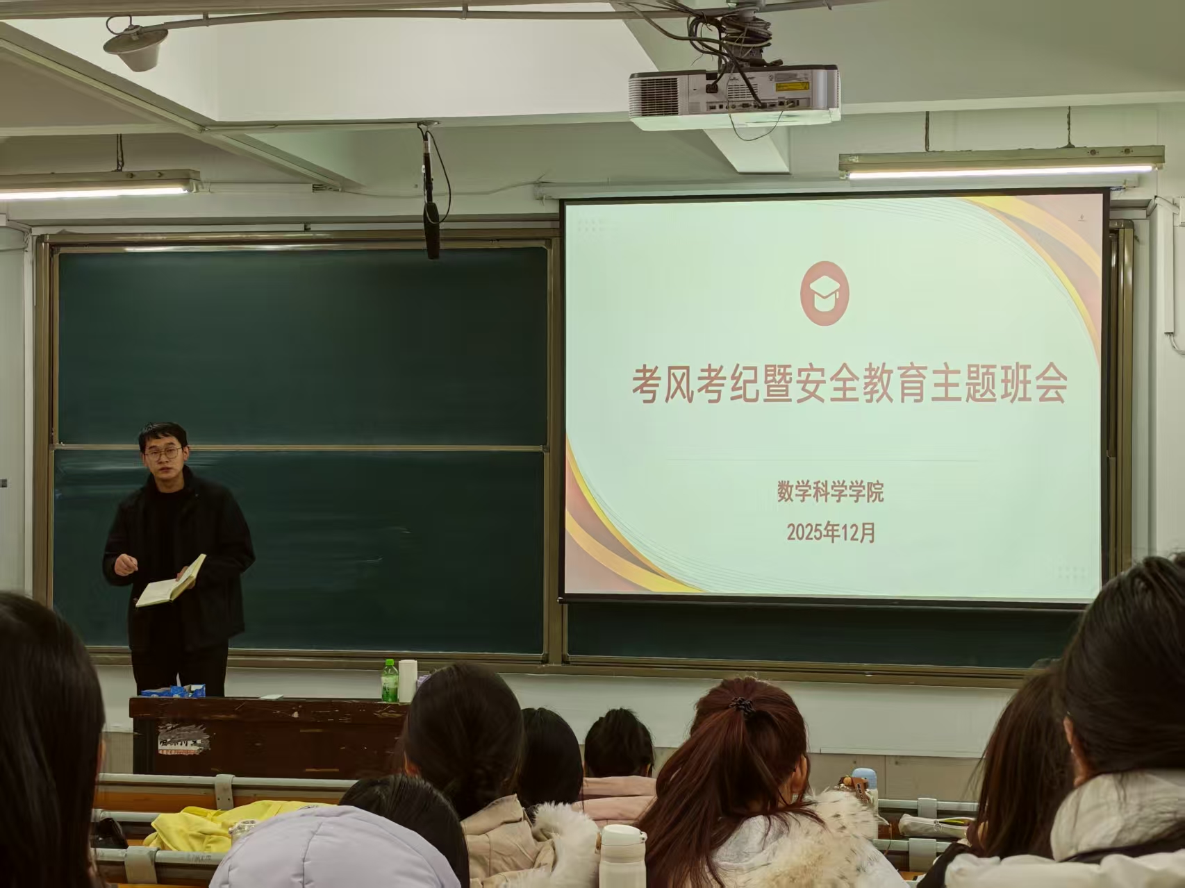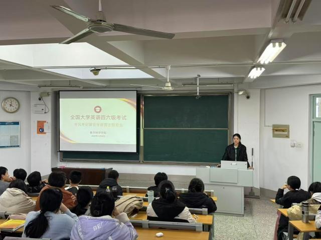 为强化学生考风考纪意识,筑牢校园安全防线,12月8日至10日,数学科学学院于11号教学楼教室组织开展考风考纪暨安全教育主题班会。本次班会围绕当前学业与生活中的重点问题,从英语四六级考风考纪与安全教育两方面进行系统讲解。