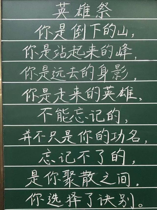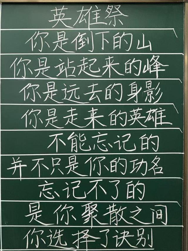活动期间,同学们以黑板为纸、粉笔为墨,围绕“铭记英烈,薪火相传”主题书写缅怀革命先烈的经典诗词。书写过程中,同学们既注重字形结构的规范美观,又讲究章法布局的整体协调,更将真挚的情感融入笔墨挥洒之间,一幅幅工整有力的《致敬英雄》,一段段慷慨激昂的《英雄祭》在黑板上依次呈现,既展现了同学们扎实的教学基本功,又传递出他们对革命先烈的深切缅怀与崇高敬意。活动结束后,同学们表示将以此次活动为契机,把对革命先烈的崇敬之情转化为砥砺前行的实际行动,传承红色基因,担当时代使命,用奋斗书写属于新时代的青春篇章。