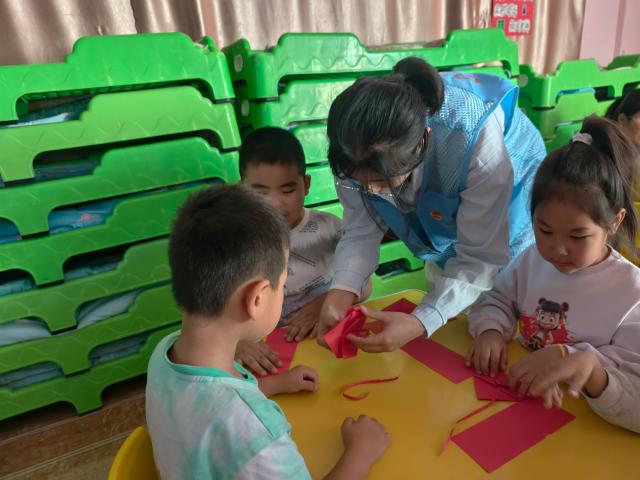 活动伊始,志愿者以“保护大家的英雄”为主题,通过播放烈士事迹视频,搭配生动有趣的语言讲解,让小朋友们初步感受英雄烈士的勇敢精神与奉献情怀。随后,志愿者化身“红色故事讲解员”与“童心陪伴者”,手持绘有英烈小故事的绘本,向小朋友们讲述英雄事迹,并带领小朋友们齐唱改编版的红色童谣,欢快的旋律中传递出崇敬之情。接着,志愿者把提前准备好的彩纸、胶棒等工具分发给小朋友们,并手把手地指导大家制作“小红花”,一朵朵鲜艳的“小红花”,成为小朋友们致敬英雄的专属礼物。最后,小朋友主动分享自己的感受,志愿者们为积极参与的小朋友们送上小奖励,让红色记忆伴着笑容定格。