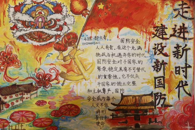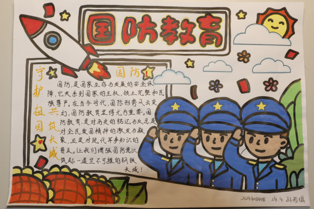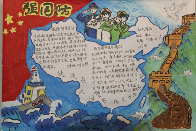 在创作过程中,参赛者认真查阅相关资料,围绕国防历史、现代军事科技、英雄事迹等主题展开创作,用手中的画笔描绘出心中的国防画卷,精心设计版面,力求将每一份手抄报都打造成兼具思想性与艺术性的佳作。色彩搭配上,有的运用浓烈的红色与深沉的蓝色,营造出庄重而热烈的氛围;有的则巧妙地使用绿色与黄色,展现出国防事业的生机与希望。绘画手法上,写实细致入微,将军事场景、军人形象刻画得栩栩如生;卡通则生动可爱,以幽默风趣的形式传播国防知识,这些手抄报不仅是艺术作品,更是同学们深入学习国防知识的成果展示。许多学生表示,通过参与此次活动,对国防知识有了更全面、更深入的了解,深刻认识到国防事业与每个人息息相关。