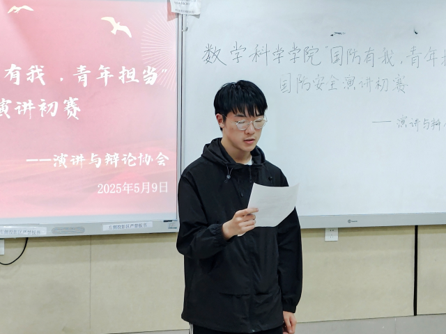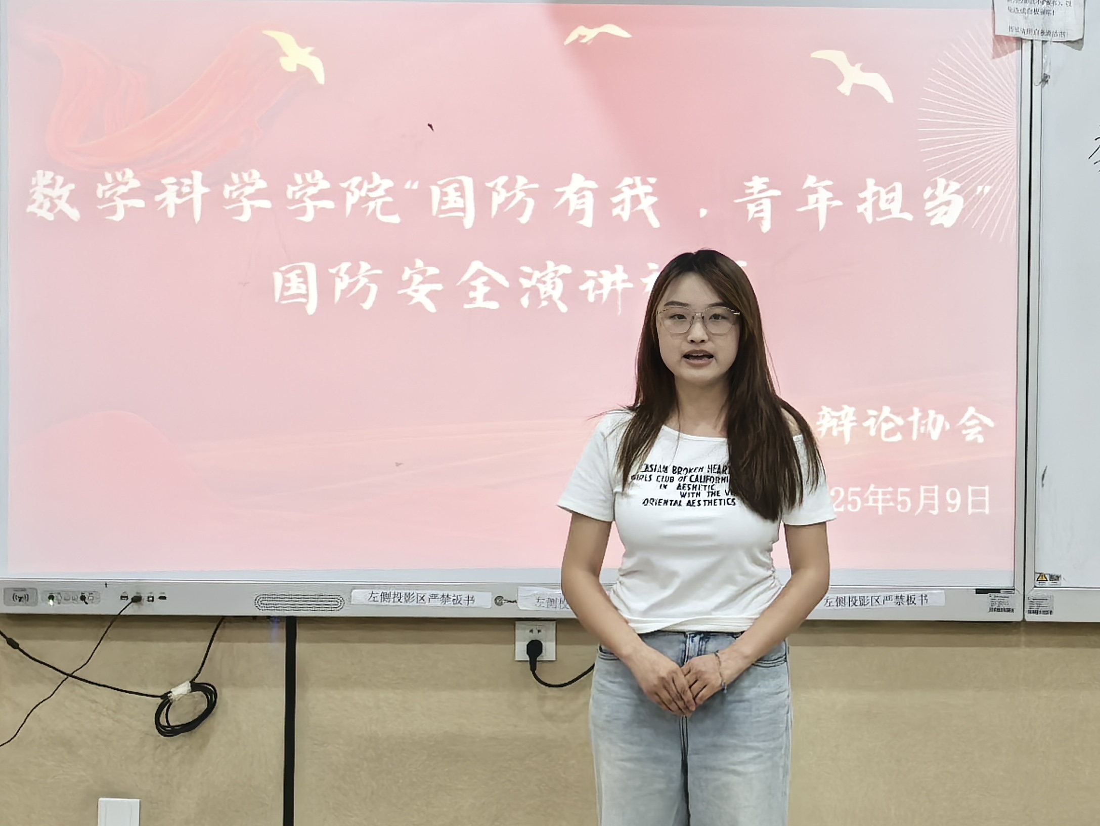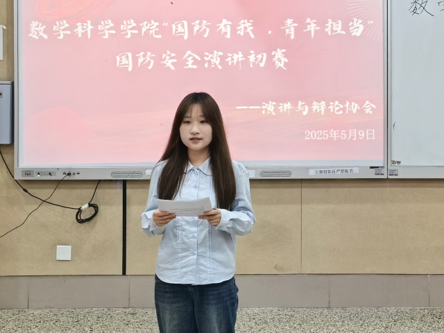 为凝聚学生的国防共识,激发同学的时代担当,5月9日,数学科学学院演讲与辩论协会于11号教学楼A304教室开展“国防有我,青年担当”国防安全演讲比赛活动,2024级部分学生参加。