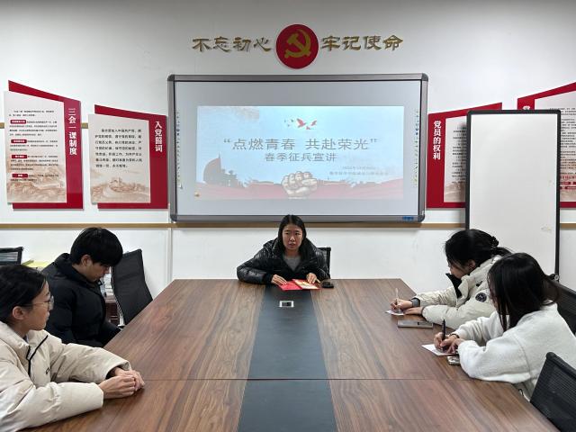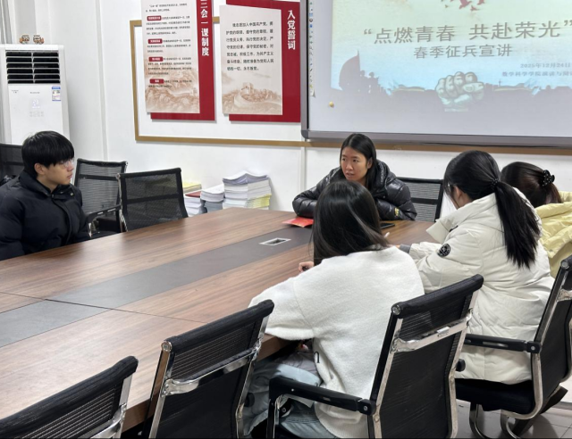 为响应国家征兵号召,鼓励青年学生投身国防事业,12月24日,数学科学学院于11号教学楼B304教室举办“点燃青春,共赴荣光”春季征兵宣讲会,本次活动由辅导员范海燕主讲,2022级部分学生参加。