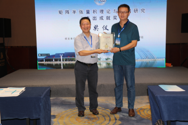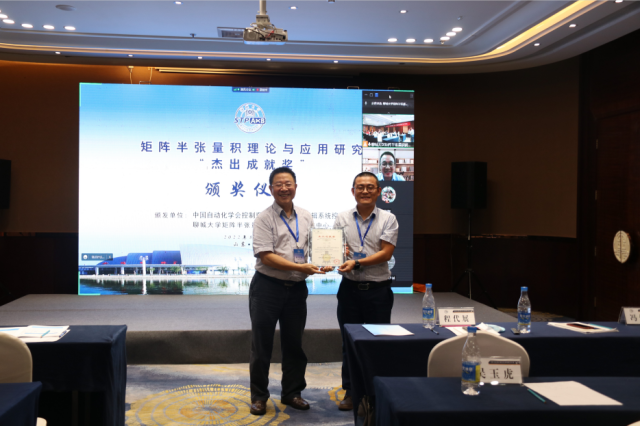 最后,TCCT逻辑系统控制学组主任、中心副主任冯俊娥宣布第三届“矩阵半张量积理论与应用研究杰出成就奖”获得者为浙江师范大学刘洋教授。矩阵半张量积理论创始人、IEEE Fellow、IFAC Fellow 程代展研究员为第二届获奖者李海涛教授与第三届获奖者刘洋教授颁奖。