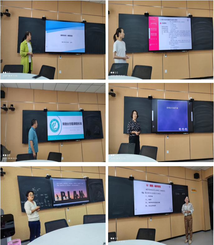 分析与方程教研室:盛秀艳、张昕丽课程团队,袁乐乐、刘利英团队,王增桂、刘玉堂团队分别对《数学分析一》《数学分析三》《常微分方程》进行 “说课程标准”和“说课程内容”。王增桂、刘玉堂团队还说了 “课改方案”。