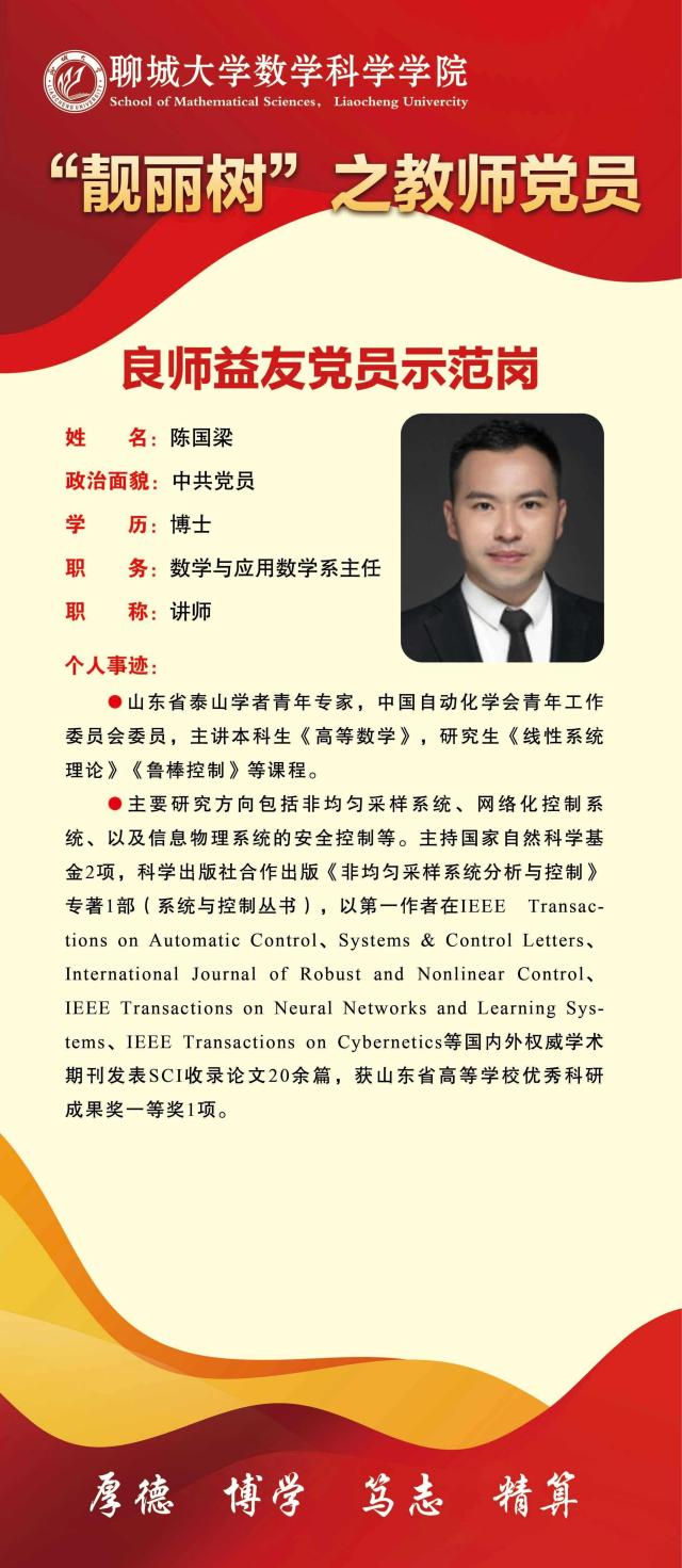 “靓丽树” | 亮出党员身份 争做先进标杆——良师益友党员示范岗 发布时间: 2022-11-08 为进一步发挥党员先锋模范作用,强化党员意识,铭记党员身份,履行党员义务。数学科学学院开展了以“亮党员身份、立先进标杆、树先锋形象”为主要内容的“靓丽树”活动,激励全体党员在新的奋进之路上,勇于担当、锐意进取、干事创业、攻坚克难,以接力跑的姿态带领全院师生紧握时代赋予的“接力棒”,锚定前进方向,笃定前行速度,铆足实干动力,在新赛道上奋力奔跑出数学“加速度”。