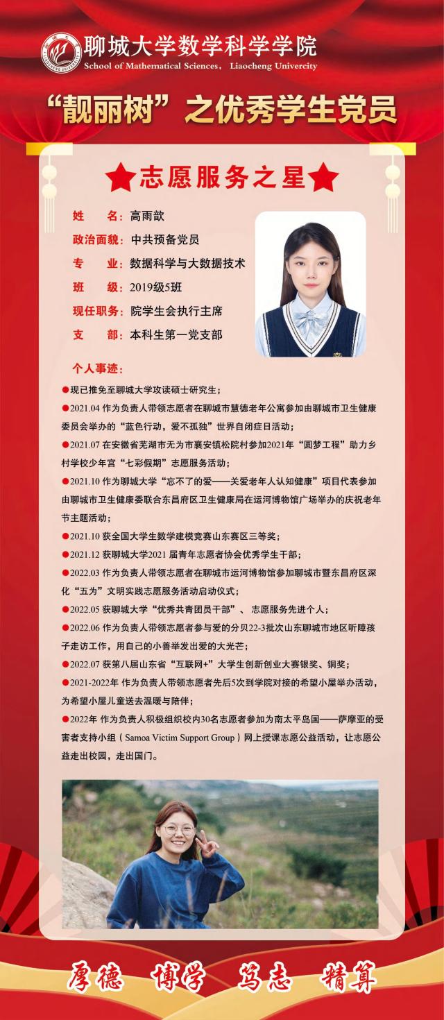 “靓丽树” | 亮出党员身份 争做先进标杆——志愿服务之星 发布时间: 2022-11-09 为进一步发挥党员先锋模范作用,强化党员意识,铭记党员身份,履行党员义务。数学科学学院开展了以“亮党员身份、立先进标杆、树先锋形象”为主要内容的“靓丽树”活动,激励全体党员在新的奋进之路上,勇于担当、锐意进取、干事创业、攻坚克难,以接力跑的姿态带领全院师生紧握时代赋予的“接力棒”,锚定前进方向,笃定前行速度,铆足实干动力,在新赛道上奋力奔跑出数学“加速度”。