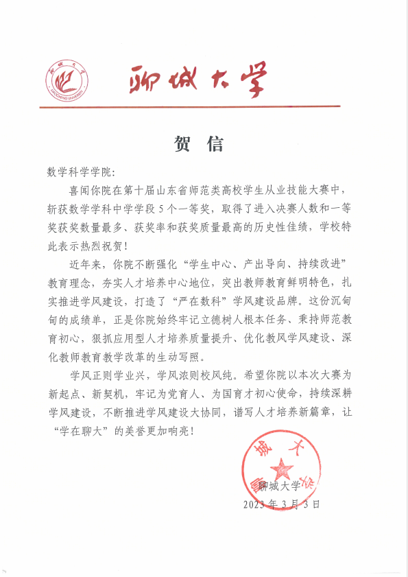 近日,学校向海角 发来贺信,向学院在第十届山东省师范类高校学生从业技能大赛中,斩获数学学科中学学段5个一等奖,取得了进入决赛人数和一等奖获奖数量最多、获奖率和获奖质量最高的历史性佳绩,表示热烈祝贺!