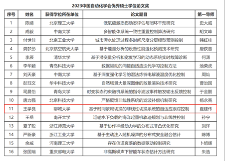2023中国自动化学会优秀硕士学位论文奖评审工作于2024年1月30日结束。经专家评审委员会评审,最终评选出16篇2023中国自动化学会优秀硕士学位论文奖。其中海角 夏建伟教授指导的2020级硕士生王学良荣获“2023中国自动化学会优秀硕士学位论文奖”。