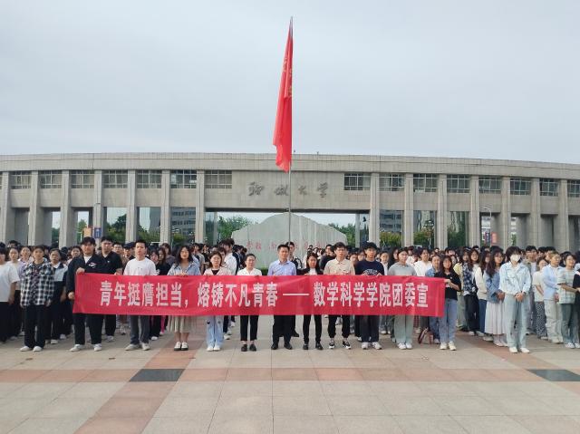 百舸争流千帆竞,青年自当志凌云。为引导青年学生坚定不移跟党走,在奋斗中释放青春激情、追逐青春理想,展现青年学子的责任担当,5月27日,数学科学学院于西校区十一广场举行“青年挺膺担当,熔铸不凡青春”主题升旗仪式。数学科学学院党委副书记、副院长张进军,团委书记岳琳琳,辅导员范海燕出席本次仪式,学生党员代表及本科一、二年级全体同学参加。
