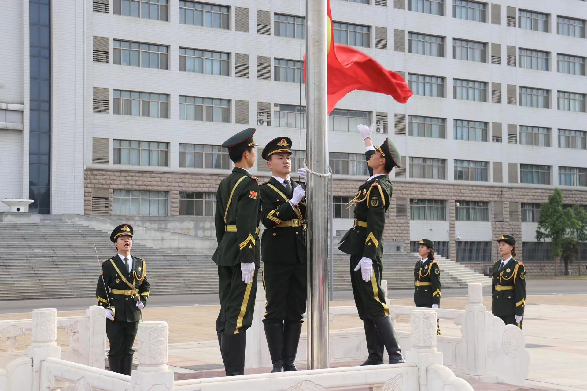 青年怀壮志,奋进正当时。伴着初升的红日,升旗仪式拉开了序幕。国旗护卫队迈着铿锵有力的步伐,护送国旗向主席台迈进。庄严的国歌声响起,升旗手振臂一挥,鲜艳的五星红旗在空中划出一道美丽的弧线。全体师生肃立致敬,向国旗行注目礼,坚定的目光里满含对祖国的崇高敬意与最美好的祝福。