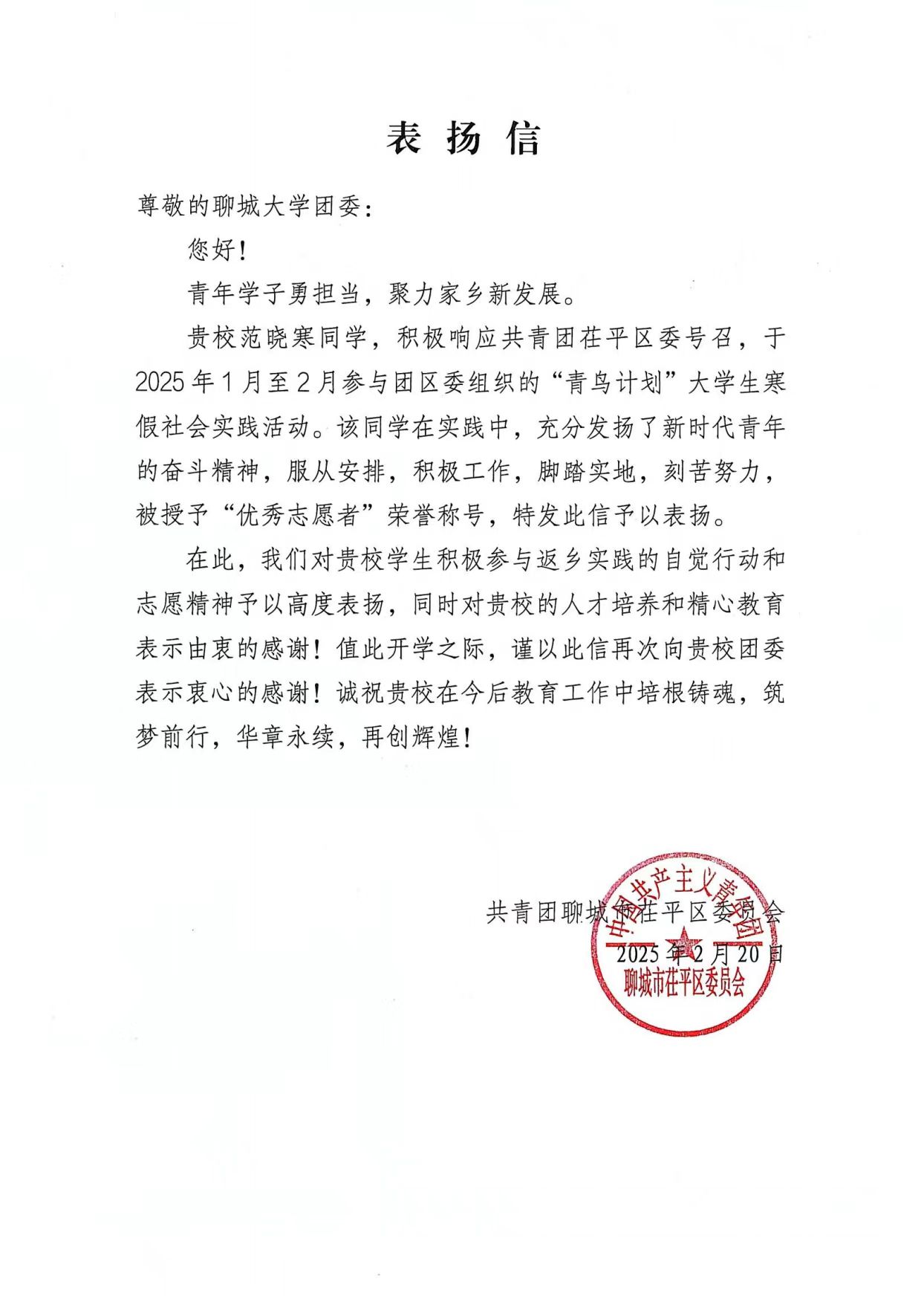 本封表扬信不仅是对海角 学生的高度肯定,更是对海角 学生参加社会实践活动的极大鼓舞与激励。社会实践是大学生思想政治教育的重要环节,对于促进大学生了解社会,奉献社会,增强社会责任感具有不可替代的作用。海角 将以此为新的起点,鼓励更多青年学生走出校园,走向社会,以实际行动诠释新时代青年的责任与担当,用智慧和汗水书写属于聊大学子的精彩篇章。