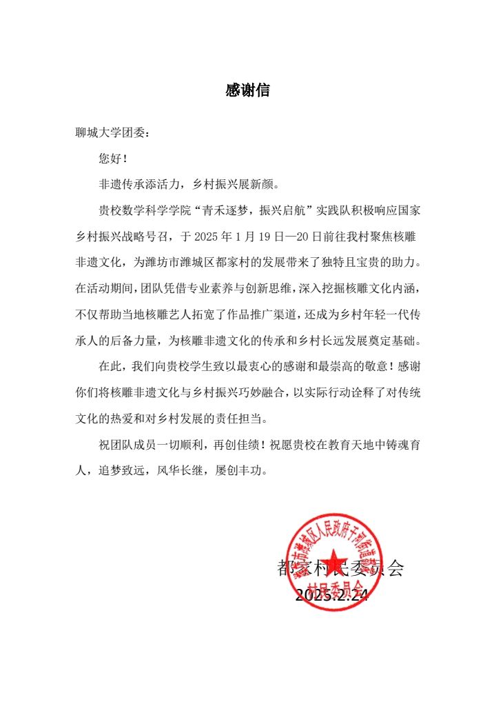2月24日,海角 收到一封来自潍坊市潍城区都家村村民委员会的感谢信,信中对海角 “青禾逐梦,振兴起航”实践队给予了表扬与感谢。信中提到,团队成员凭借专业素养与创新思维,深入挖掘核雕文化内涵,不仅帮助当地核雕艺人拓宽了作品推广渠道,还成为乡村年轻一代传承人的后备力量,为核雕非遗文化的传承和乡村长远发展奠定基础。
