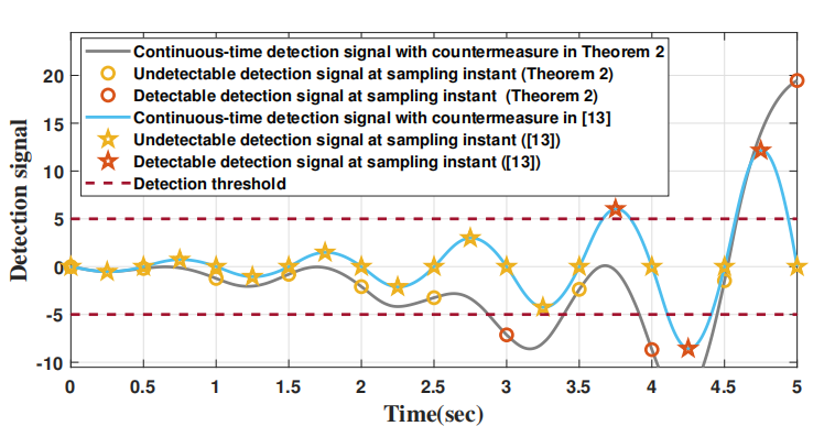 本文研究了一类针对网络化非均匀性采样控制系统的隐蔽攻击——零动态攻击的设计与防御策略。从攻击者视角出发,首次提出了针对非均匀性采样控制系统的零动态攻击设计方法。该策略确保在采样时刻检测信号始终保持为零,从而使设计的零动态攻击能够实现隐蔽性。从防御者角度,提出通过引入时间间隙的异步采样保持对抗机制。这种对抗措施有效破坏了零动态攻击的隐蔽性,实现了攻击检测,检测效率明显提升,并增强了系统安全性。研究证明,在每个采样间隔内,由异步采样保持所引发的时间间隙至少存在一处能够使攻击信号被检测到。