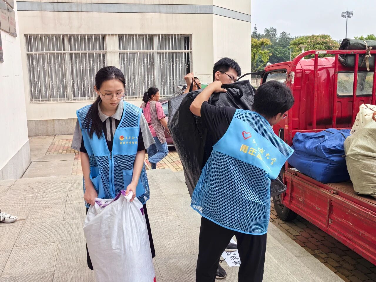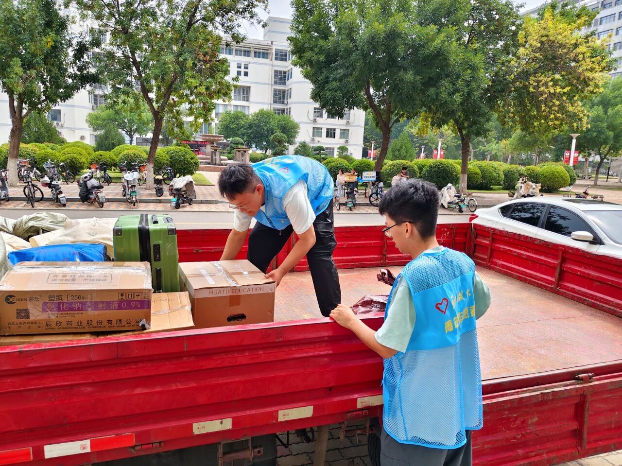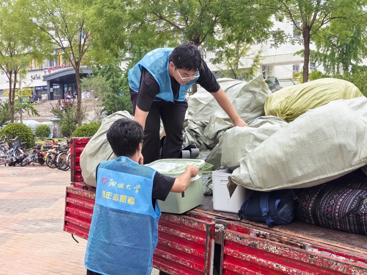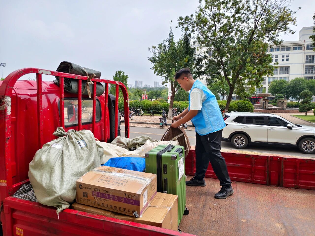 活动前期,学院提前规划路线,划分服务区域,在教学楼、宿舍楼入口处设置“志愿服务岗”。志愿者身穿蓝色马甲分工明确、相互协作,倾注爱心与奉献,反复往返于教学楼与宿舍楼之间,全力确保搬运行李工作顺利有序进行。从教学楼到宿舍楼,从装车到托运,志愿者们或搬运沉重包裹,或耐心打包零散物品,搭建起校园内的爱心运输线,他们热情地帮助学生搬运行李,用实际行动展现着雷锋精神,用汗水诠释着“奉献、友爱、互助、进步”的志愿服务精神。