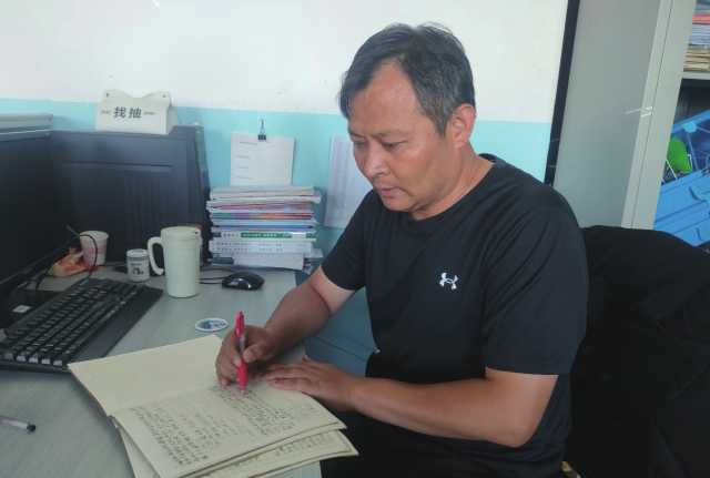 陈铭意在办公桌前认真撰写教学笔记,厚厚的笔记里是他21年深耕教育的思考与沉淀