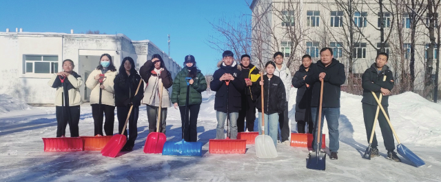 冬日里,陈铭意与学生们手持铲雪工具,在校园中开展扫雪活动,用行动诠释师生同心