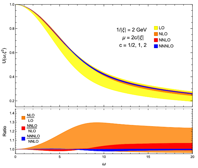 图2:领头阶(LO)、次领头阶(NLO)、次次领头阶(NNLO)、次次次领头阶(N3LO)下的夸克关联函数的预测值和理论误差