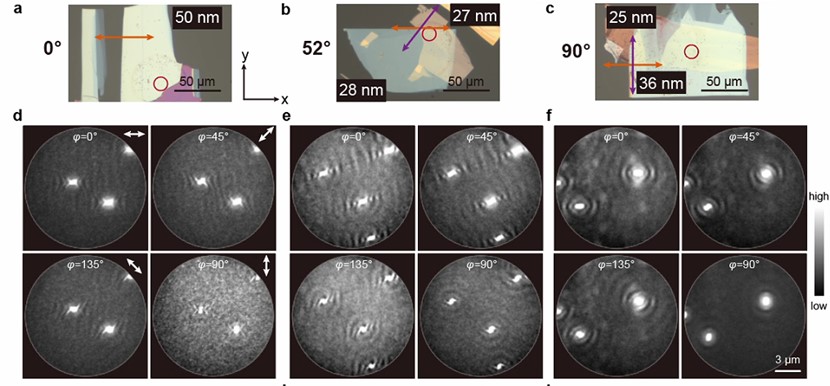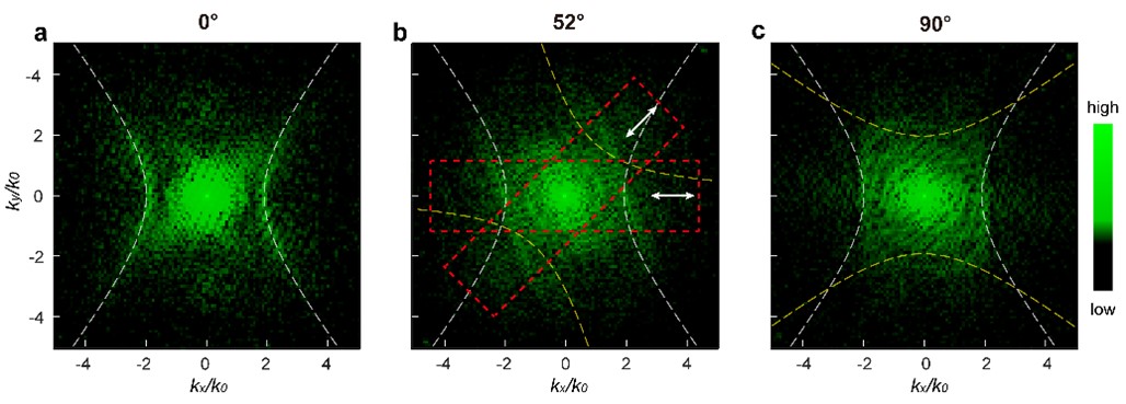 为进一步调控MoOCl2双曲等离激元的各向异性行为,研究团队进行了MoOCl2层间转角和入射光偏振的调控,实现了等频线从双曲到直线再到椭圆的拓扑变换和偏振选择性激发(图3)。实验结果表明在层间转角为52°时,k空间等频线转变为直线,对应的实空间模式表现为定向传输,在入射光偏振为45°时可以进一步提高定向传输的方向性。同时,通过偏振选择性激发可以重构出完整的等频线(图4),为实际应用中极化激元的调控提供指导。