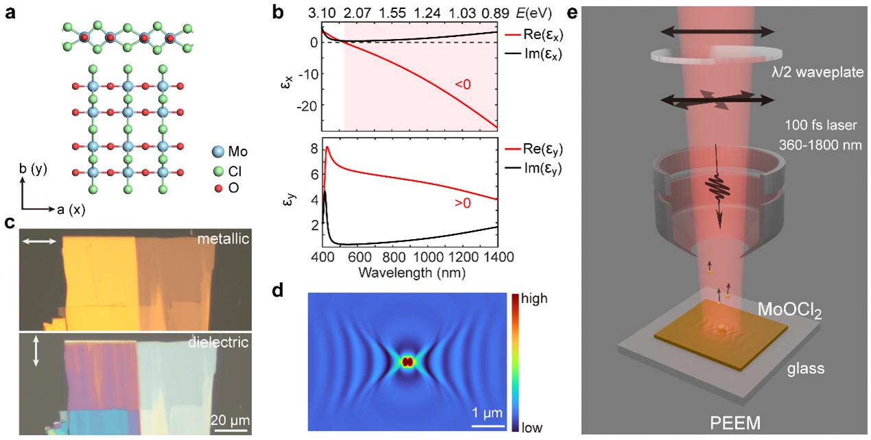 图1. (a)MoOCl2晶体结构、(b)折射率参数、(c)光镜图、(d)双曲等离激元模式及(e)PEEM测量示意图。