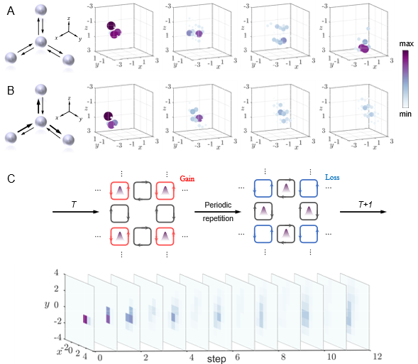 图3. 三维空间非互易耦合及周期性非厄米调制的实验结果。(A) 三维互易耦合示意图及T=1、3、5、7时间步实验结果。(B) 三维非互易耦合示意图及T=1、3、5、7时间步实验结果。(C) 周期性非厄米调制。上图:周期性非厄米调制示意图,格点环在奇数时间步为增益态,下一时间步为损耗态,该过程周期性重复。下图:非厄米时间调制实验结果。