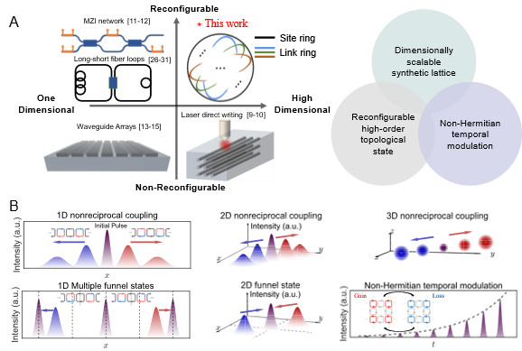 图1. 可重构高维合成晶格实现方案。(A) 光学系统中态演化模拟的实现方案。右上为本工作方案示意图,系统由位点环与多个连接环构成,每个周期位点环与连接环经历两次耦合。右侧示意图展示了本工作在功能上的三个特性:维度可扩展合成晶格、可重构高阶拓扑态及非厄米时间调制。(B) 本工作在非互易耦合、漏斗态及非厄米时间调制等功能上的演化过程示意图。