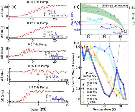 图2:多周期泵浦下非线性信号的依赖关系。 非线性信号的光谱权重(c)在满足共振条件时出现增强,证实了其与π带希格斯模的关联 。