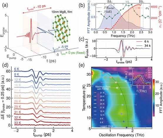 图3:单周期太赫兹泵浦-探测实验结果。 实验观测到一个频率与莱格特模吻合的强阻尼振荡(d, e),证实了通过单周期脉冲可以选择性激发莱格特模 。