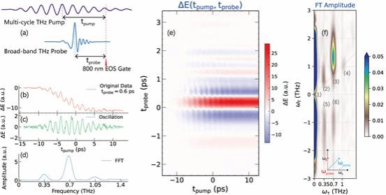 图1:多周期太赫兹泵浦-探测实验结果。 二维傅里叶变换频谱(f)可以分解出不同的非线性过程,并识别出与希格斯模相关的信号 。