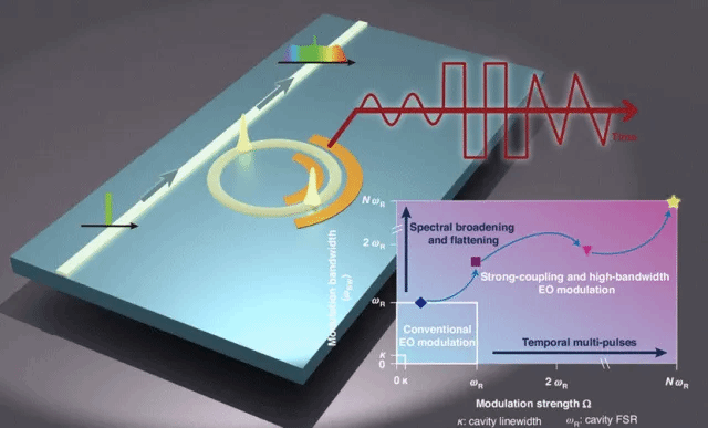 基于电光效应(泡克尔斯效应)的电光脉冲与频率梳是相干通信、微波光子学、精密计量、光子互连与量子信息等应用的核心。其中,基于光学微腔的电光频率梳通过在微腔中引入相位调制来产生光频梳:当泵浦光在微腔中穿过微波驱动的相位调制器时,微波引起的电光耦合会生成新的频率分量(被称为边带)。光学微腔放大了这一效应,从而能够提供生成超大频谱展宽的光频梳,因而备受关注。另一方面,微波驱动的相位调制等效的在不同频率模式之间形成了电光耦合,为合成维度研究拓扑、非厄米物理等系统打下了坚实基础。但长期以来。微腔电光频梳一直停留在弱耦合工作区域(即调制引起的等效耦合强度远小于腔中模式的自由光谱程),导致梳形与脉冲形态对泵浦波长异常敏感,系统必须依靠严格的共振锁定与精细的温控与反馈才能维持稳定输出,这在复杂环境与大规模部署中代价高昂、可靠性受限。同时,从物理角度来讲,相位调制引起的电光耦合仅仅施加单一的紧邻耦合相互作用,大大的限制了合成维度这一领域的丰富物理研究。基于此问题,海角