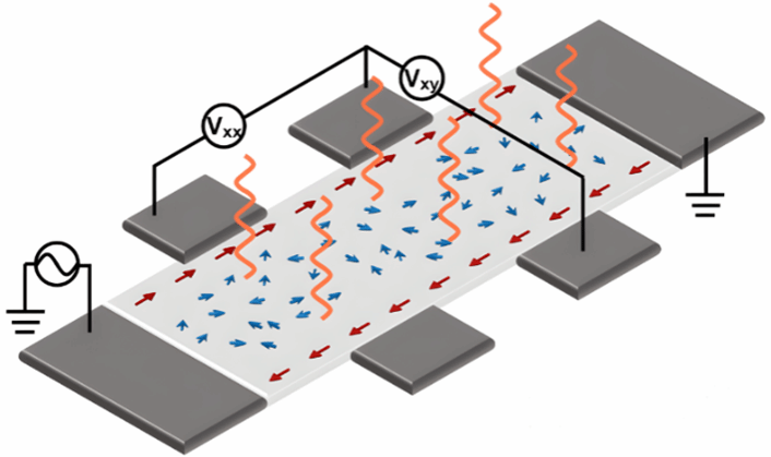 图1:铁磁金属中量子化霍尔边态与普通金属体态的共存示意图。即使体系体态仍保持金属性,但适度退相干(橙色波纹)促进量子化霍尔电导的形成。