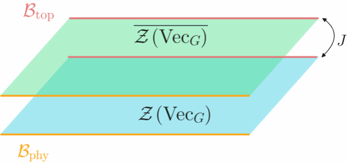 图1 | 混态系统的对称性拓扑场论示意图,其中双层代表双份对称性的对称性拓扑场论,上下两端分别是拓扑边界和动力学边界。