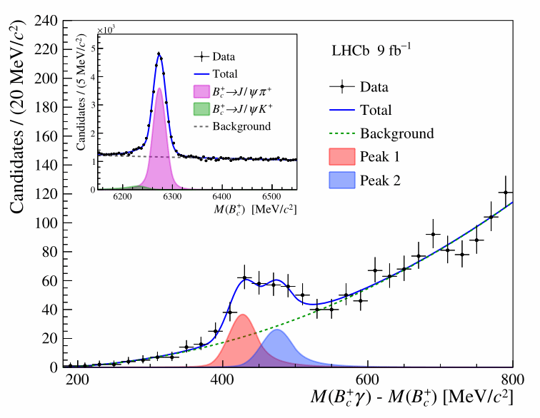 研究团队首次在实验中观测到由底夸克和粲夸克组成的Bc+介子的轨道激发态,并测量了其质量和相对基态的产生截面,在重味强子谱学研究中取得新的重要进展。2025年12月3日,相关研究成果分别以“Bc+介子轨道激发态的发现”(Observation of orbitally excited Bc+ states)和“Bc+γ质量谱中Bc(1P)+态的研究”(Study of Bc(1P)+ states in the Bc+γ mass spectrum)为题,发表于《物理评论快报》(Physical Review Letters)和《物理评论D》(Physical Review D),并双双获得编辑推荐(Editors’ Suggestion)。