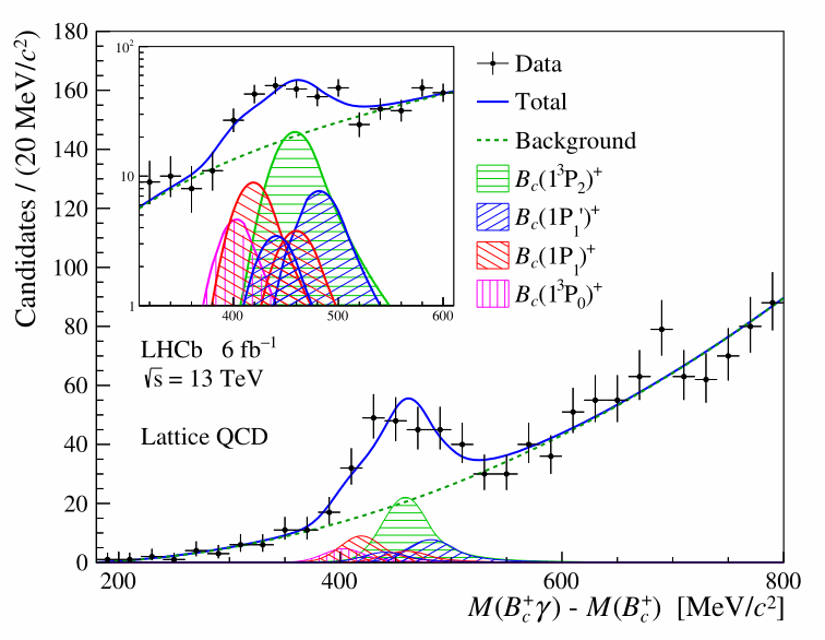 研究团队利用LHCb探测器在一期、二期运行期间采集的质子-质子对撞数据样本,通过重建Bc(1P)+→Bc+γ衰变过程,对Bc+介子的1P轨道激发态展开寻找,在理论预言的质量区间内首次观测到统计显著性超过7个标准差的宽峰结构;该结构的有效宽度明显大于当前探测器分辨率下的单峰预期值,表明其中包含多个Bc(1P)+态叠加的贡献。随后,分别采用不依赖理论输入的双峰叠加有效模型和基于理论预言的六峰叠加模型拟合Bc+γ不变质量谱(见下图),对Bc(1P)+激发态的等效峰位和产额进行了测量。以格点QCD第一性原理计算为基准,实验测得的相对产生截面与理论预言一致。首次发现Bc+介子1P轨道激发态及对其产生性质的测量,拓宽了重味强子谱学的研究边界,也为人们深入理解强子内部结构、非微扰QCD机制提供了新的实验视角和关键输入。