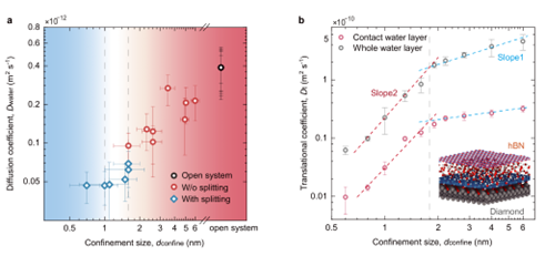 该研究系统揭示了水在极端受限条件下独特的结构与动力学行为,为纳米受限水诸多反常物性的根源提供了统一的物理图像。此外,这些结果成功解决了纳米流体领域长期存在的关键争议,表明纳米通道中的流体不再是简单的液体流,而可能形成“类固体”的无摩擦输运(即超润滑行为),有望在海水淡化、水收集、纳米过滤、能量捕获等方向引发颠覆性技术变革。