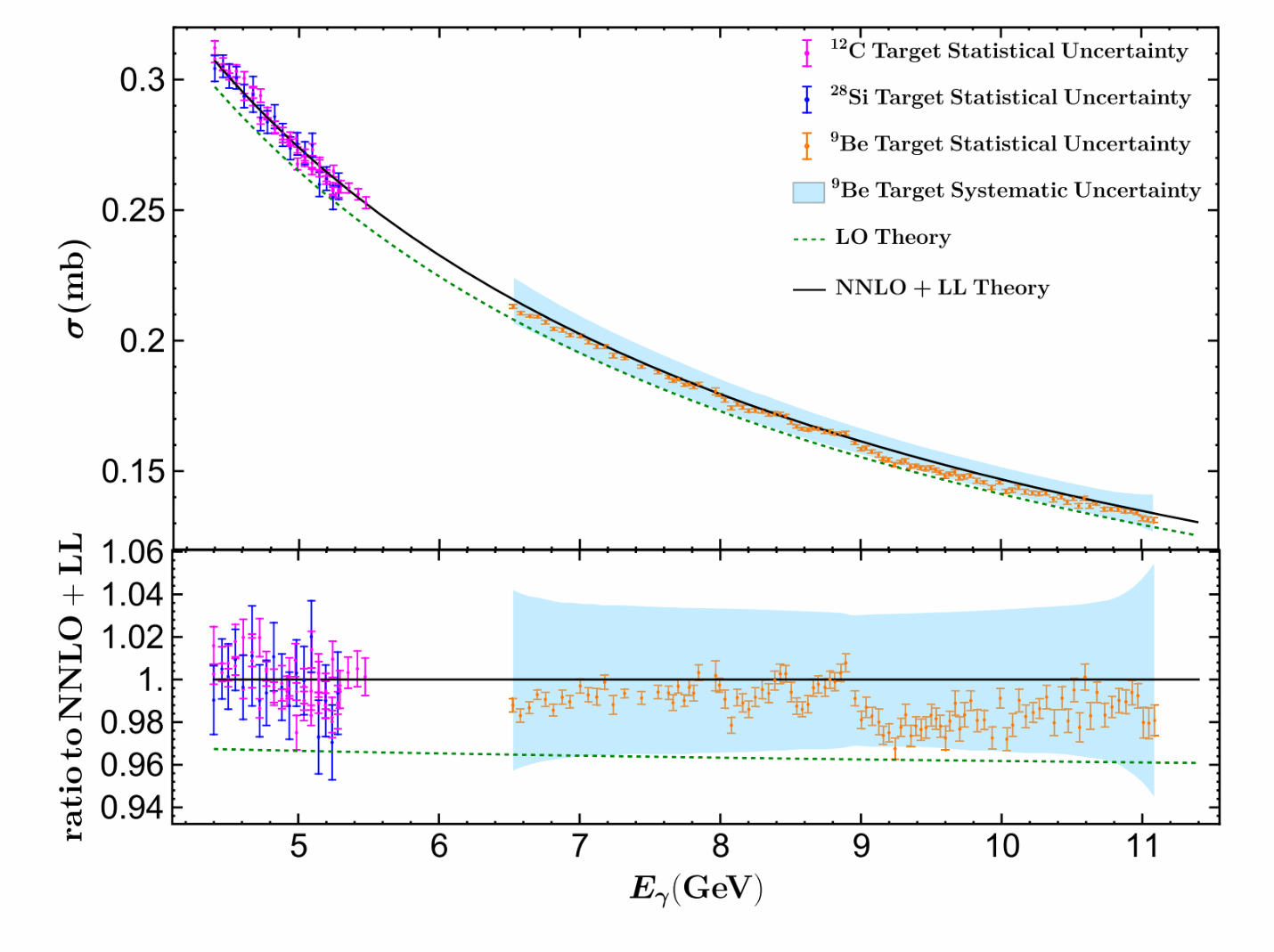 图2: Compton散射理论与实验比较。比较了PrimEx(4.400-5.475GeV)和GlueX(6.5-11.1GeV)数据与理论的领头阶和次次领头阶+领头对数结果。次领头阶的结果与次次领头阶+领头对数的结果图上视觉效果相当因此未被展示。