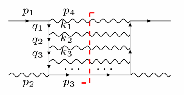 在分析双对数来源方面,研究通过动量区域分析方法,揭示所有阶的领头双对数行为来源于梯子图(图1)中电子传播子的Glauber动量模式,且辐射出的软光子满足多Regge极限,即其光锥分量严格排序、横动量处于同一量级。在此极限下,研究计算了所有阶的领头对数系数,并完成了相应的全阶重求和。