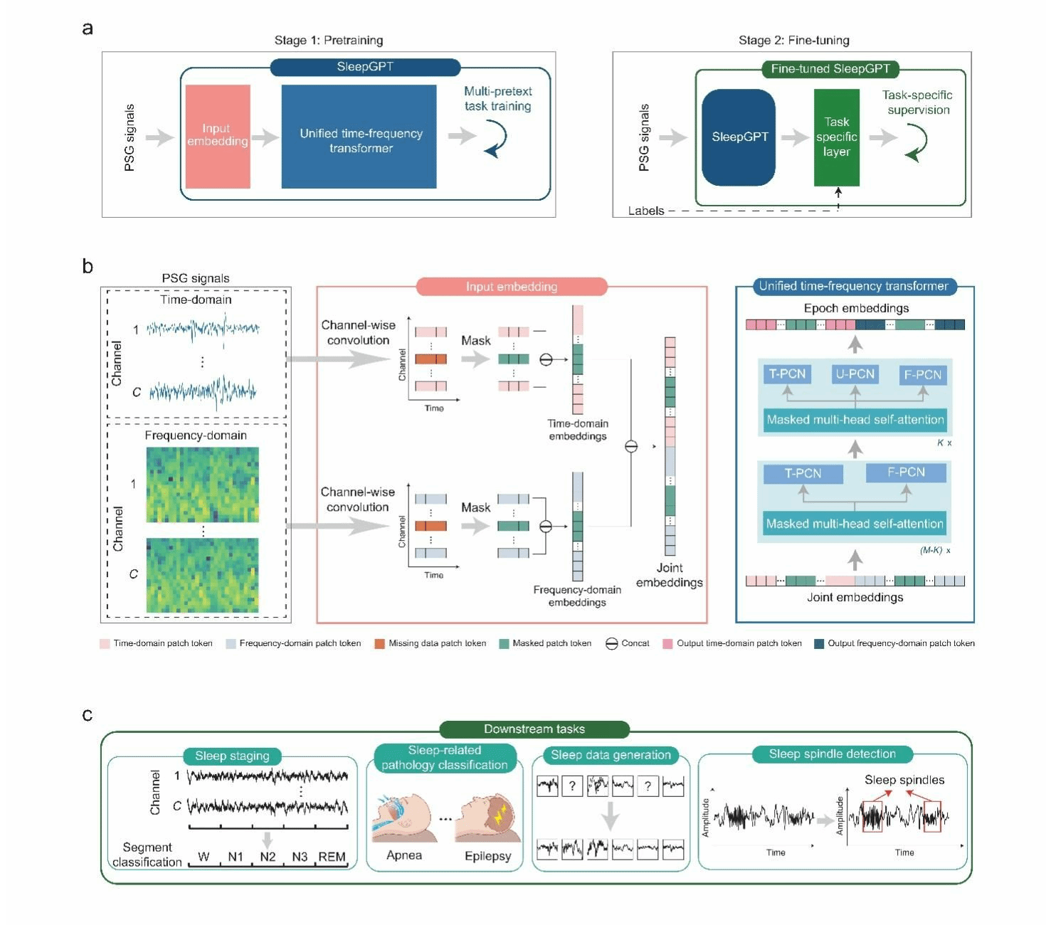 针对上述挑战,研究团队将SleepGPT定位为“时频域基础模型”(time-frequency foundation model),提出多预训练任务策略,在86,335小时PSG、覆盖8,377名受试者的数据上完成生成式预训练。模型结构中引入两项关键设计(图1):其一是通道自适应机制,用于适配真实世界中常见的可变导联/通道配置;其二是统一时频融合模块,在模型内部实现时域与频域信息的深层交互,而非简单拼接或彼此独立建模,从而提升跨数据集泛化与多任务扩展能力。