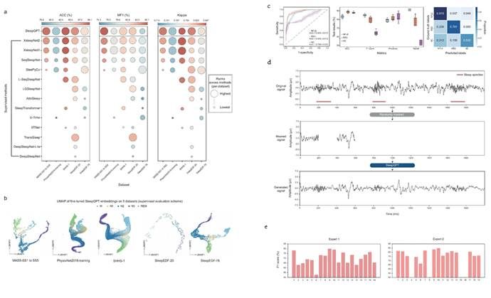 在多种PSG数据集上的系统评测表明,SleepGPT在睡眠分期、睡眠相关病理分类、睡眠数据生成与睡眠纺锤波检测等多类任务中形成新的性能基准(图2);同时,模型还能揭示与任务相关的通道特异性与睡眠阶段特异性生理模式,为可解释的睡眠计算提供线索。