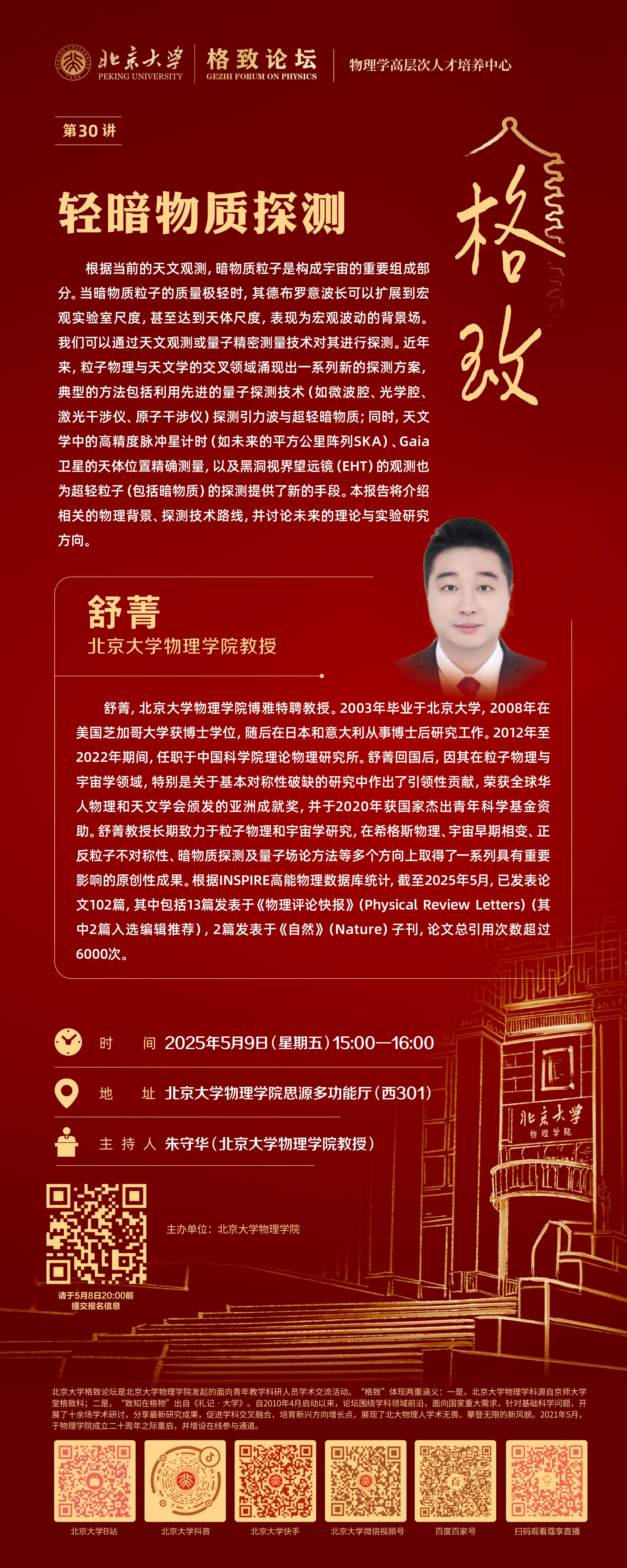 ,2008年在美国芝加哥大学获博士学位,随后在日本和意大利从事博士后研究工作。2012年至2022年期间,任职于中国科学院理论物理研究所。舒菁回国后,因其在粒子物理与宇宙学领域,特别是关于基本对称性破缺的研究中作出了引领性贡献,荣获全球华人物理和天文学会颁发的亚洲成就奖,并于2020年获国家杰出青年科学基金资助。舒菁教授长期致力于粒子物理和宇宙学研究,在希格斯物理、宇宙早期相变、正反粒子不对称性、暗物质探测及量子场论方法等多个方向上取得了一系列具有重要影响的原创性成果。根据INSPIRE高能物理数据库统计,截至2025年5月,已发表论文102篇,其中包括13篇发表于《物理评论快报》(Physical Review Letters)(其中2篇入选编辑推荐),2篇发表于《自然》(Nature)子刊,论文总引用次数超过6000次。