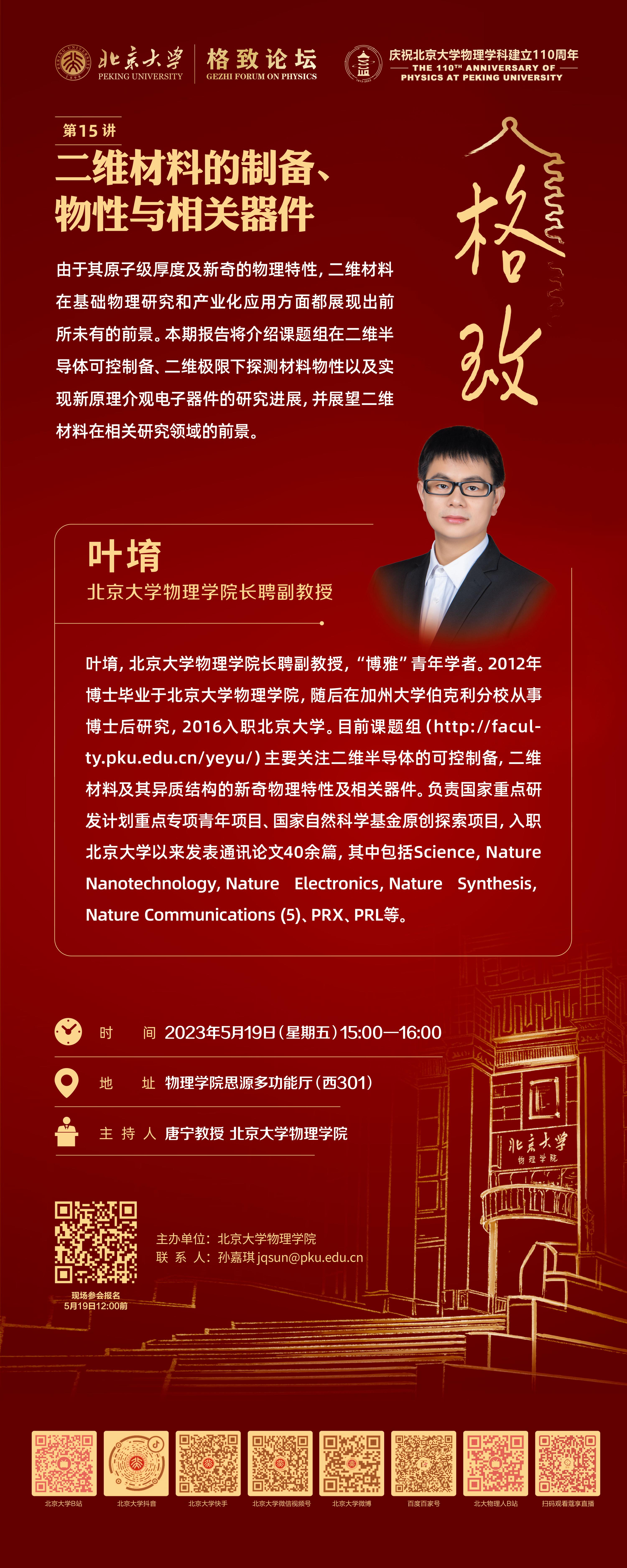 由于其原子级厚度及新奇的物理特性,二维材料在基础物理研究和产业化应用方面都展现出前所未有的前景。本期报告将介绍课题组在二维半导体可控制备、二维极限下探测材料物性以及实现新原理介观电子器件的研究进展,并展望二维材料在相关研究领域的前景。
