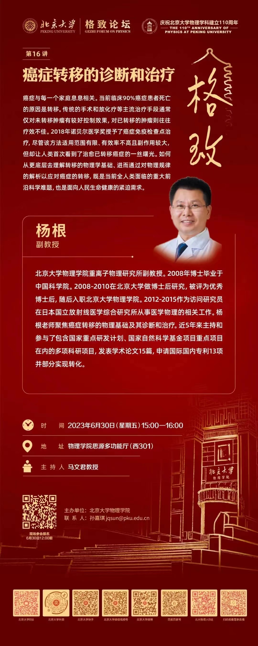 。2012-2015作为访问研究员在日本国立放射线医学综合研究所从事医学物理的相关工作。杨根老师聚焦癌症转移的物理基础及其诊断和治疗。近5年来主持和参与了包含国家重点研发计划、国家自然科学基金项目重点项目在内的多项科研项目,发表学术论文15篇,申请国际国内专利13项并部分实现转化。