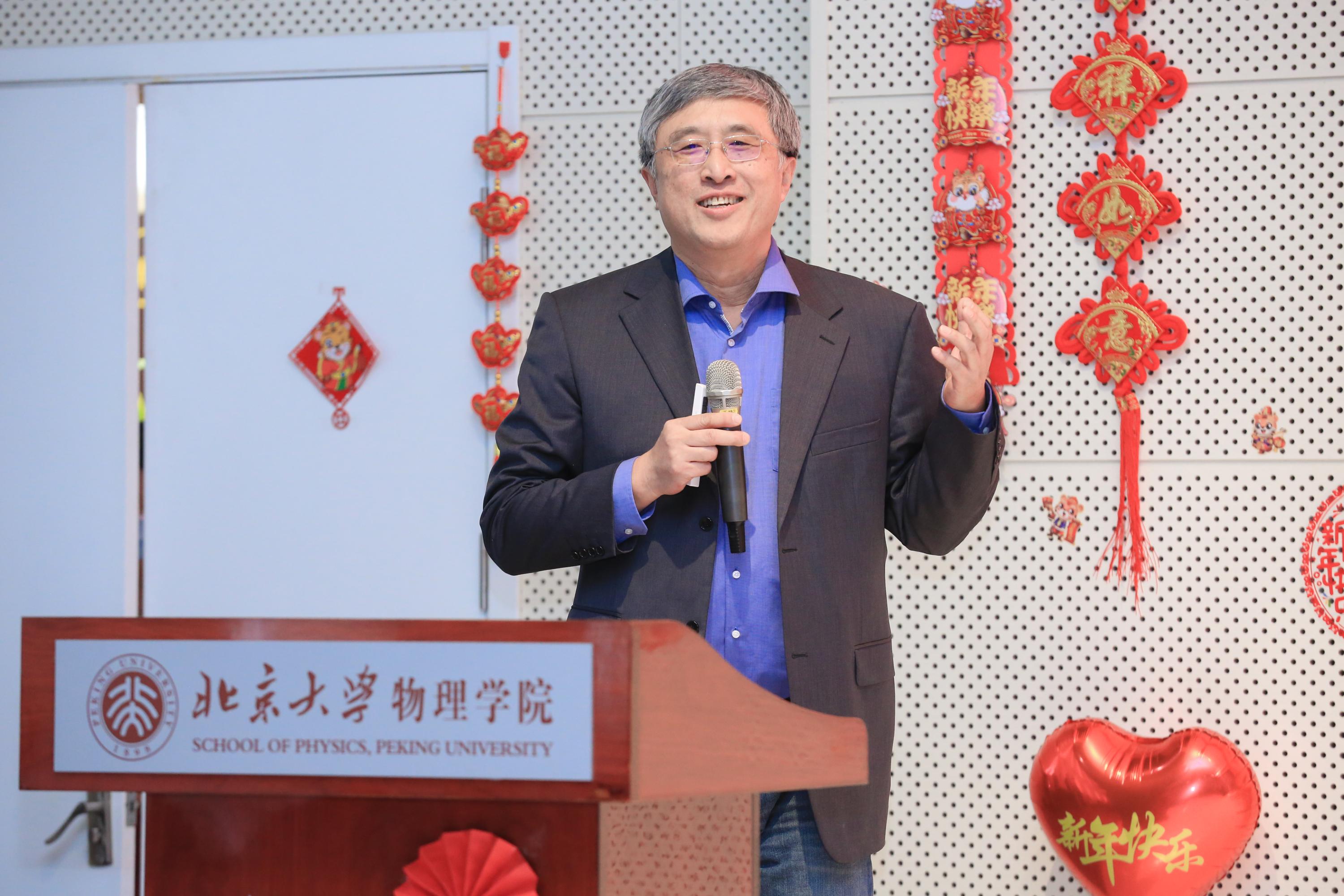 高原宁院长通过党委强基赋能综合改革、“三全”“五育”涵养未来栋梁、“八个坚持”指导人才队伍建设、“四个面向”引领学科建设、国家需求驱动能力建设、多元平台提升交流合作、安全保障升级品质园区等主题,全面回顾了学院在党建强基、人才培养、队伍建设、学科建设、能力建设、交流合作、行政支撑、校友工作等诸方面所取得的突出成绩,总体上实现了“十四五”开好局、起好步的预期目标。同时,他也指出,应当清醒地认识到只见“高原”鲜见“高峰”的现状,未来几年,谋事蓄势与躬身担当并举,整体推进与重点突破并举,真正提升跻身世界一流学科的实力和优势。最后,高原宁代表学院党政领导班子衷心感谢全体师生为学院发展呕心沥血,向全体师生致以美好的新年祝愿,并希望将凝聚着“北大物理”能量和温度的问候传递给海内外每一位北大物理人。