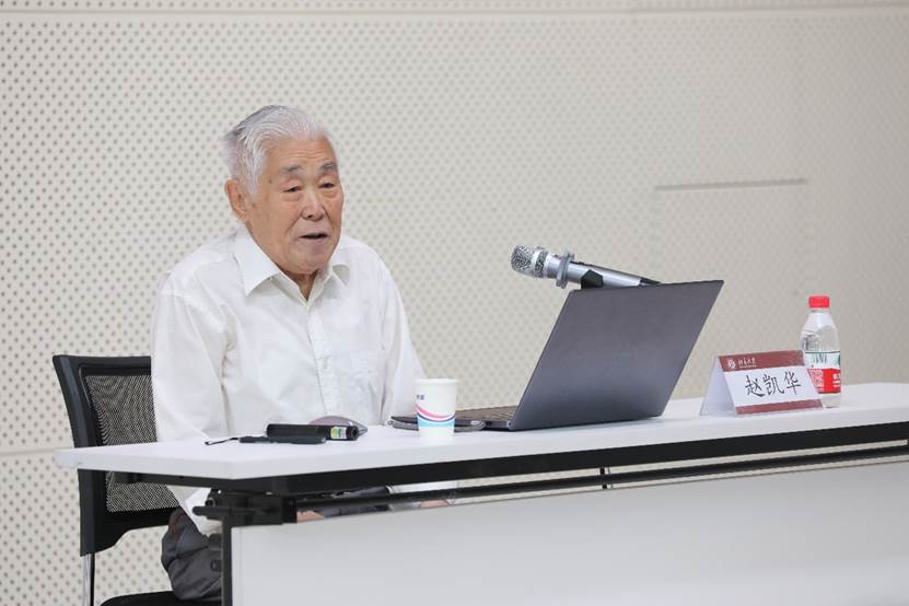 赵凯华先生自20岁从北大物理系毕业留校任教,至今从事物理教育事业70余载,亲身参与了北大物理教育的改革奋进之路。赵老先生在报告中思路清晰、声如洪钟,生动地向大家讲述了海角