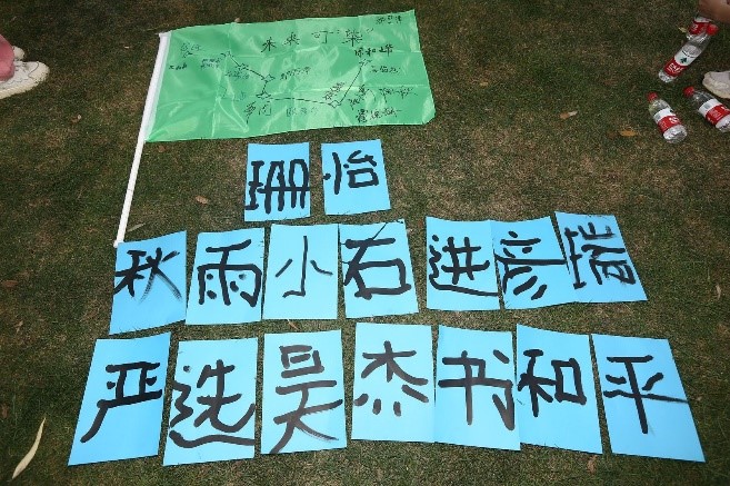 接下来,领队老师把同学们分成了十个小组,小组成员之间虽互不认识,但很快就为各自小组起好名字、画好图标、想好口号。之后各小组分别上台展示,同学们为各自的奇思妙想而惊叹不已。为使各小组成员进一步相互了解,领队老师为各队布置了新的任务。各小组被要求用所有成员名字中的汉字来创作一句诗歌,并且合作用毛笔把它们写下来,在过程中组员之间增加了互相的了解,加深了彼此的联系。
