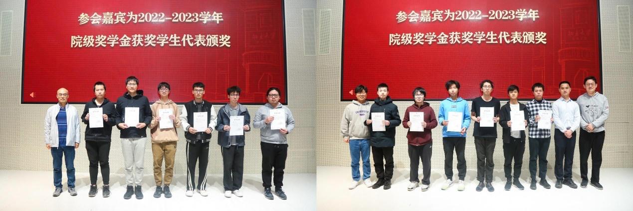 设奖校友、与会嘉宾为获奖学生颁发奖学金获奖证书,并合影留念。