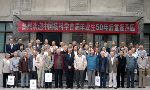 | 北大物理研究室第一届毕业生50年后重返燕园合影。前排左7周海婴、左8许智宏校长 |