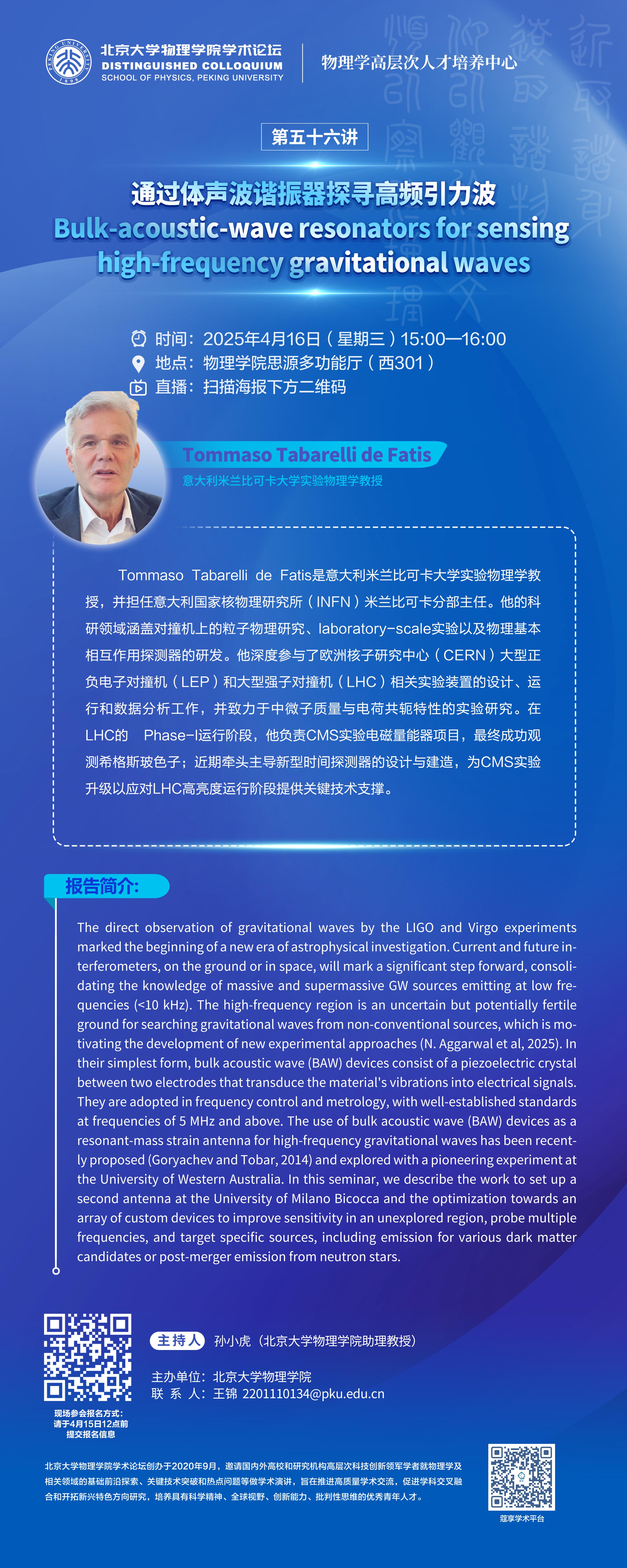Tommaso Tabarelli de Fatis是意大利米兰比可卡大学实验物理学教授,并担任意大利国家核物理研究所(INFN)米兰比可卡分部主任。他的科研领域涵盖对撞机上的粒子物理研究、laboratory-scale实验以及物理基本相互作用探测器的研发。他深度参与了欧洲核子研究中心(CERN)大型正负电子对撞机(LEP)和大型强子对撞机(LHC)相关实验装置的设计、运行和数据分析工作,并致力于中微子质量与电荷共轭特性的实验研究。在LHC的 Phase-I运行阶段,他负责CMS实验电磁量能器项目,最终成功观测希格斯玻色子;近期牵头主导新型时间探测器的设计与建造,为CMS实验升级以应对LHC高亮度运行阶段提供关键技术支撑。
