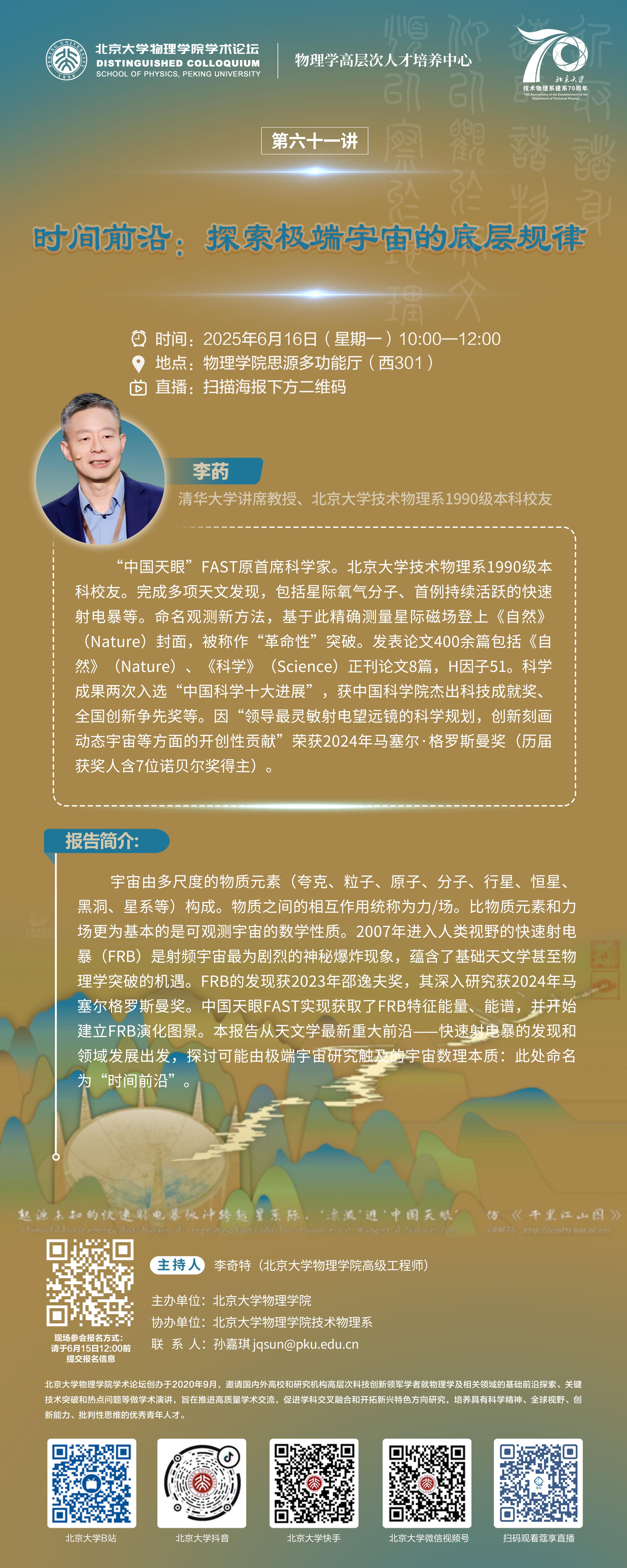 宇宙由多尺度的物质元素(夸克、粒子、原子、分子、行星、恒星、黑洞、星系等)构成。物质之间的相互作用统称为力/场。比物质元素和力场更为基本的是可观测宇宙的数学性质。2007年进入人类视野的快速射电暴(FRB)是射频宇宙最为剧烈的神秘爆炸现象,蕴含了基础天文学甚至物理学突破的机遇。FRB的发现获2023年邵逸夫奖,其深入研究获2024年马塞尔格罗斯曼奖。中国天眼FAST实现获取了FRB特征能量、能谱,并开始建立FRB演化图景。本报告从天文学最新重大前沿——快速射电暴的发现和领域发展出发,探讨可能由极端宇宙研究触及的宇宙数理本质:此处命名为“时间前沿”。
