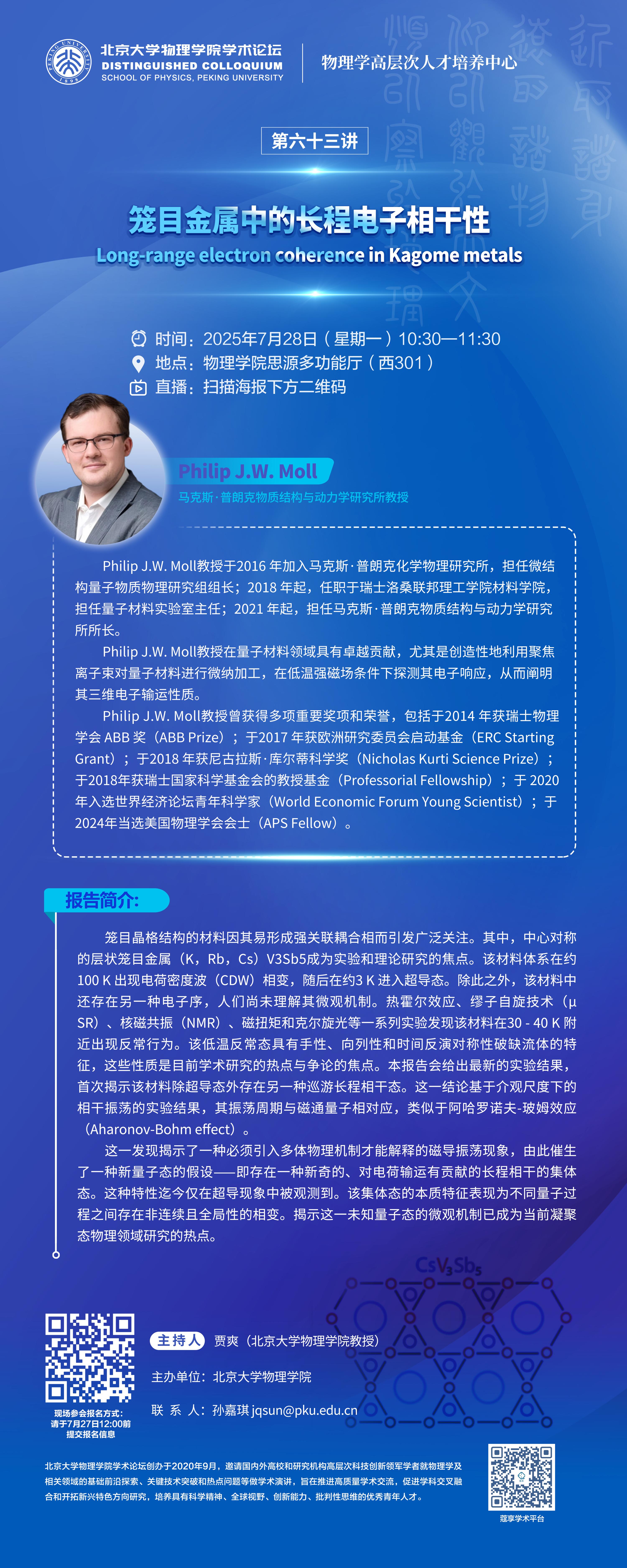 Philip J.W. Moll教授在量子材料领域具有卓越贡献,尤其是创造性地利用聚焦离子束对量子材料进行微纳加工,在低温强磁场条件下探测其电子响应,从而阐明其三维电子输运性质。