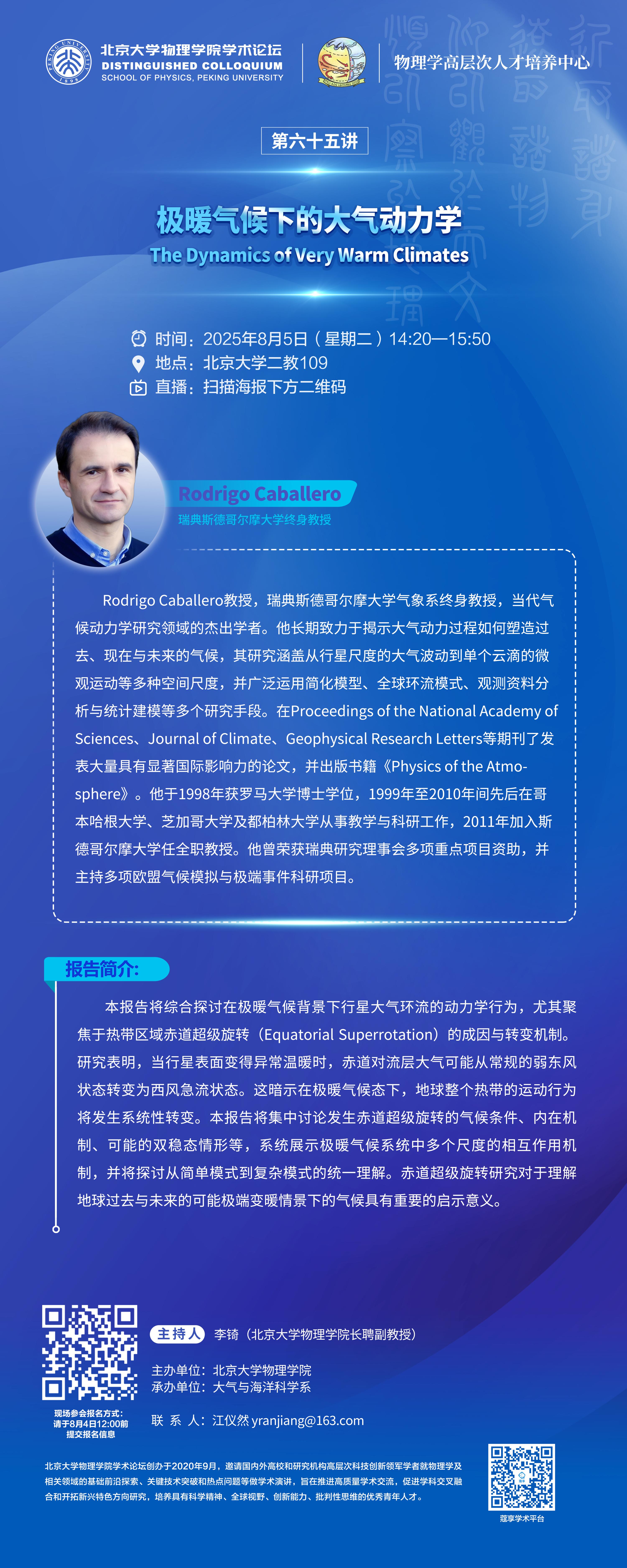 Rodrigo Caballero教授,瑞典斯德哥尔摩大学气象系终身教授,当代气候动力学研究领域的杰出学者。他长期致力于揭示大气动力过程如何塑造过去、现在与未来的气候,其研究涵盖从行星尺度的大气波动到单个云滴的微观运动等多种空间尺度,并广泛运用简化模型、全球环流模式、观测资料分析与统计建模等多个研究手段。在Proceedings of the National Academy of Sciences、Journal of Climate、Geophysical Research Letters等期刊了发表大量具有显著国际影响力的论文,并出版书籍《Physics of the Atmosphere》。他于1998年获罗马大学博士学位,1999年至2010年间先后在哥本哈根大学、芝加哥大学及都柏林大学从事教学与科研工作,2011年加入斯德哥尔摩大学任全职教授。他曾荣获瑞典研究理事会多项重点项目资助,并主持多项欧盟气候模拟与极端事件科研项目。